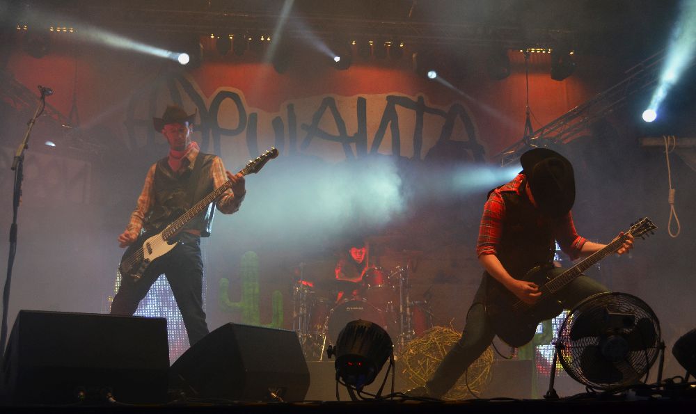 Festivaalien näyttävimmät lavasteet olivat ehdottomasti Apulannalla, joka esitteli Himoksella uuden singlebiisinsä ensimmäistä kertaa. Lavalle oli taiottu aitoa lännentunnelmaa, ja jos ei jaksanut reilua tuntia tuijotella muusikkoja, saattoi keikan aikana seurailla lavalla olevan saluunan tapahtumia.