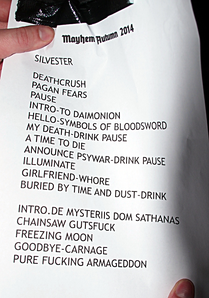 Pääpaino oli vanhassa materiaalissa. Sisääntulo suoritettiin Deathcrush-EP:ltä tutulla Silvester Anfangn -introlla, ja samaiselta lyhytsoitolta kuultiin myös Chainsaw Gutsfuck, Pure Fucking Armageddon ja intron jälkeen setin avannut nimikkoraita. Ensimmäiseltä täyspitkältä settiin mahtuivat Freezing Moon, Buried by Time and Dust ja koko albumille nimensä lainannut De Mysteriis Dom Sathanas.