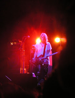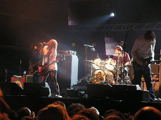Mutta kohta fiiliskäyrä lähtikin jyrkkään nousuun. Meikäläiselle festareiden ehdoton pääkohde The Jesus Lizardin jälkeen oli tuo särökitaraindien Black Sabbath ja The Beatles, Sonic Youth. Kello yhdeltä Estrella Damm -lavalla se sitten vihdoin tapahtui, näin Kimin, Thurstonin, Leen ja Steven (+ ilmeisesti Pavementin basistilla vahvistettuna) ihka elävänä. Siis tajutteekste? SONIC FUCKING YOUTH! (terveisiä vaan Rikulle) Ja hiton kovahan se oli, vaikka jotkut yhtyeen aiemmin nähneet isot pojat tiesivät sanoa keikkaa keskinkertaiseksi. Minua ei ainakaan uusien biisien paljous häirinnyt. On se The Eternal sen verta kova levy (ja todella pitkästä aikaa) että sitä sietääkin soitella. Mutta tulihan sitä klassikko-osastoakin esim. Evol-raidat Tom Violence ja Expressway to Yr Skull, Daydream Nationin Cross the Breeze sekä